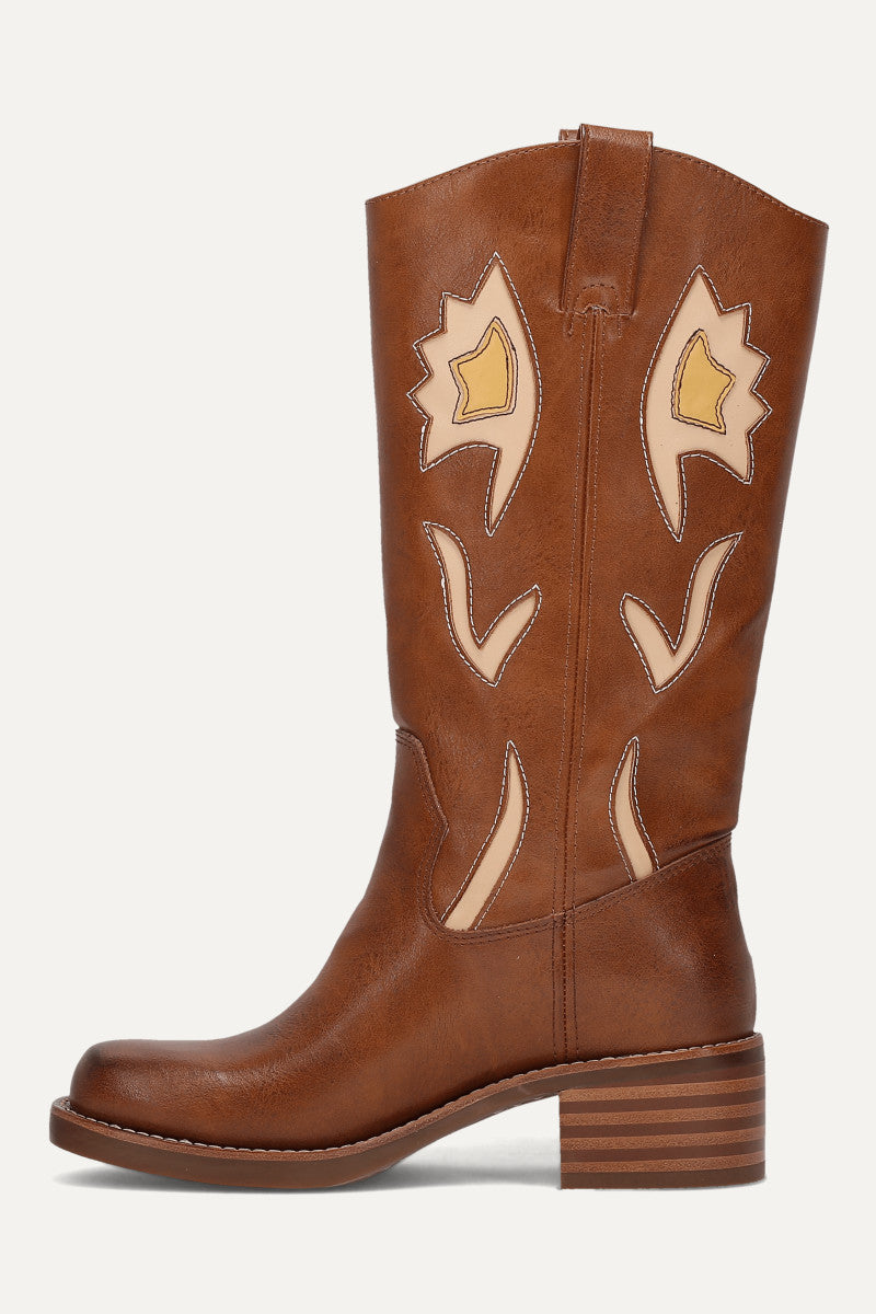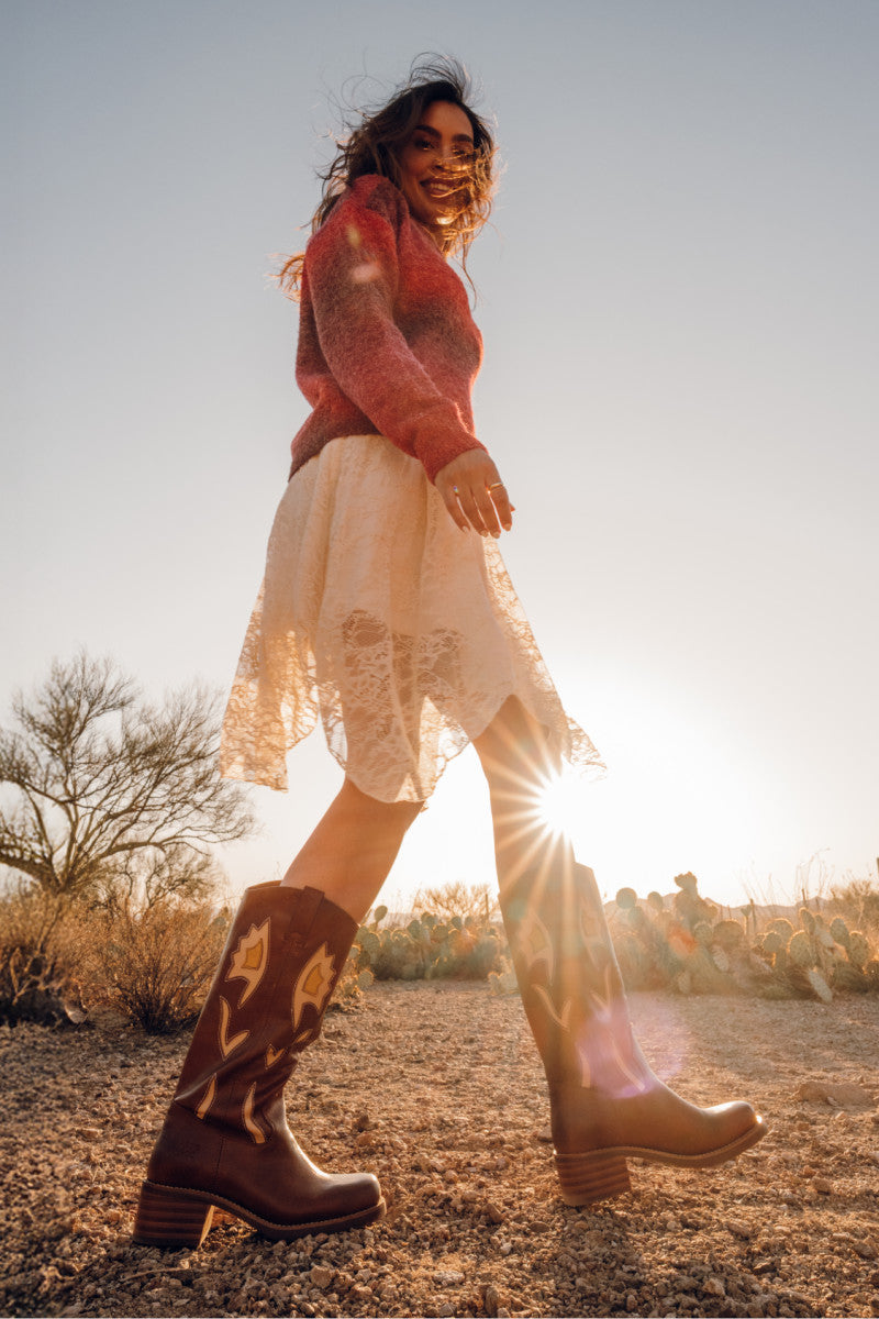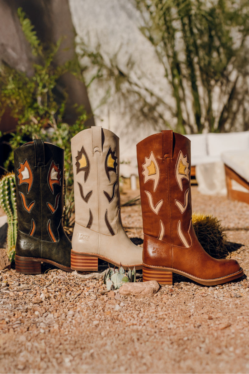 The Miranda 10 Flower boot gives off vintage vibes, featuring floral cutout details accented by colorful underlays for added depth. Made from tumbled vegan leather, these Western boots offer a cushioned flexible sole for out of the box comfort, pairing effortlessly with denim or dresses.